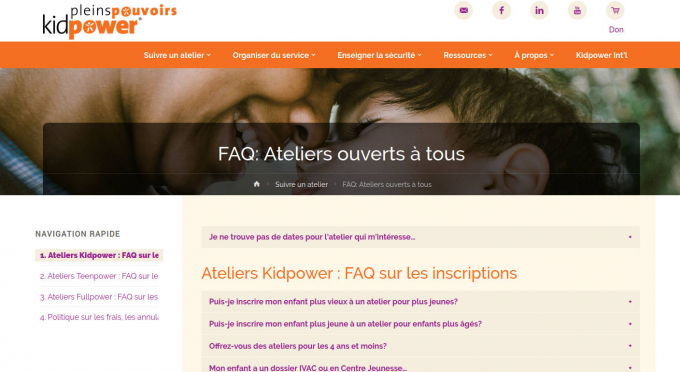 A socio-educational charity organisation, Kidpower Montreal gives to youth, and to people of all ages and capacities, the skills to be able to use their power to stay safe, act wisely, and believe in themselves. Koumbit's web development team accompanied the organisation in a redesign of their website and helped them put in place an online signup system for their Kidpower trainings.