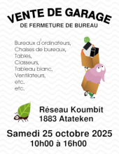Le samedi 25 octobre prochain, votre hébergeur de sites web solidaire, local et à but non-lucratif, Koumbit, organise une vente de garage de fermeture de son bureau. Ne vous inquiétez pas, on ne ferme pas Koumbit, on vide juste le grand bureau qu'on n'utilisait à peine ces dernières années.